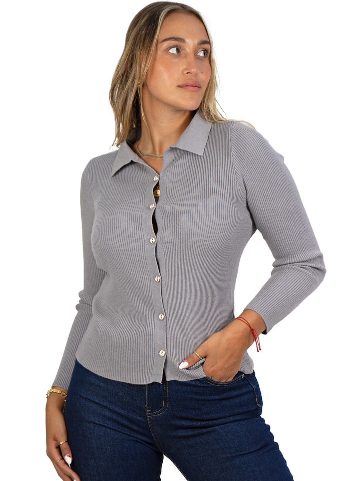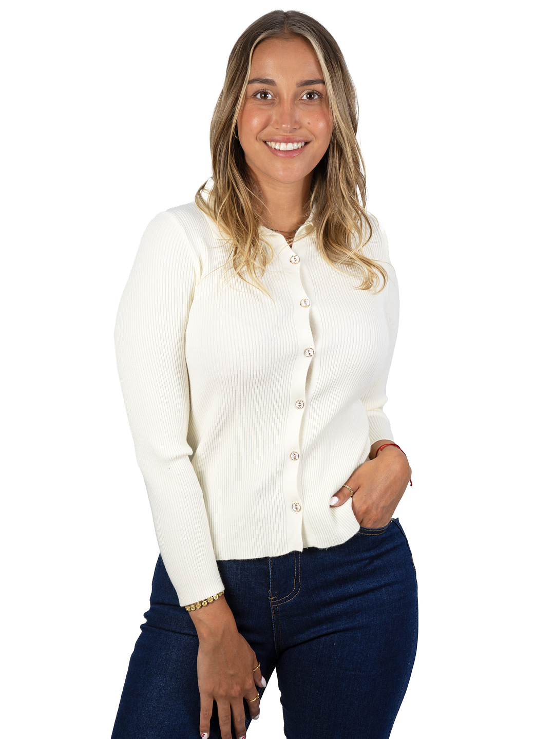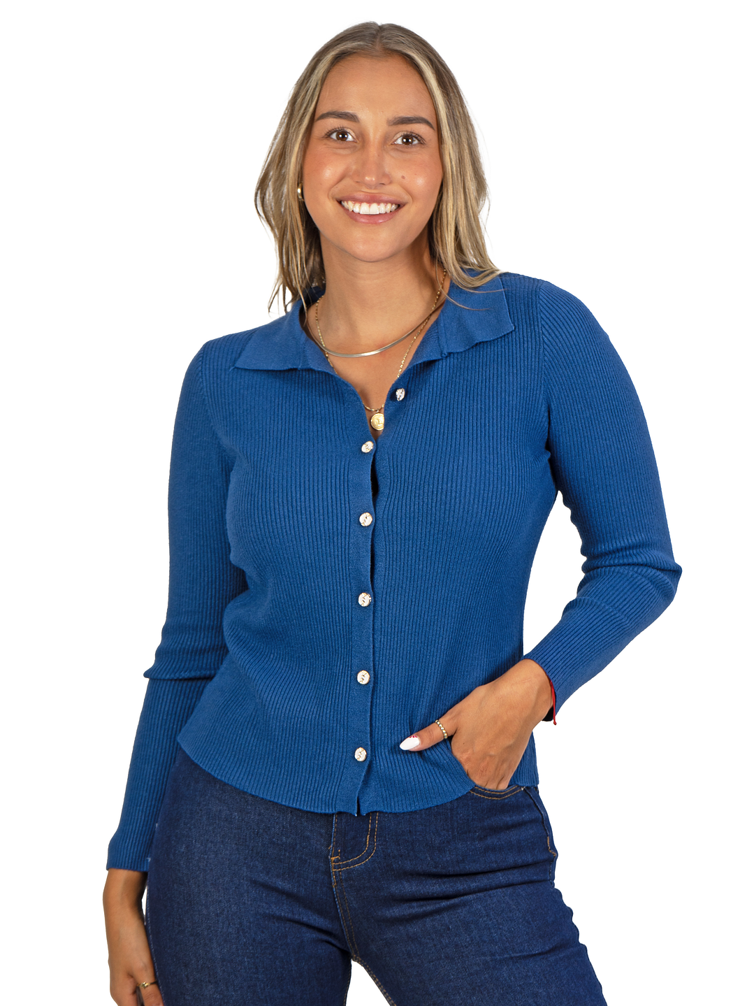 Lindo suéter de material spandex, con tejid acanalado en vertical y abotonado, de corte clásico. Ideal para llevar sobre una polera en la media temporada o como prenda interior. Disponible en una variedad de colores, te permitirá combinarlo fácilmente con tu atuendo favorito. Con su delicado detalle en el cuello tipo arrow, también puedes usarlo como capa principal abierto o cerrado, adaptándose a tu estilo según prefieras