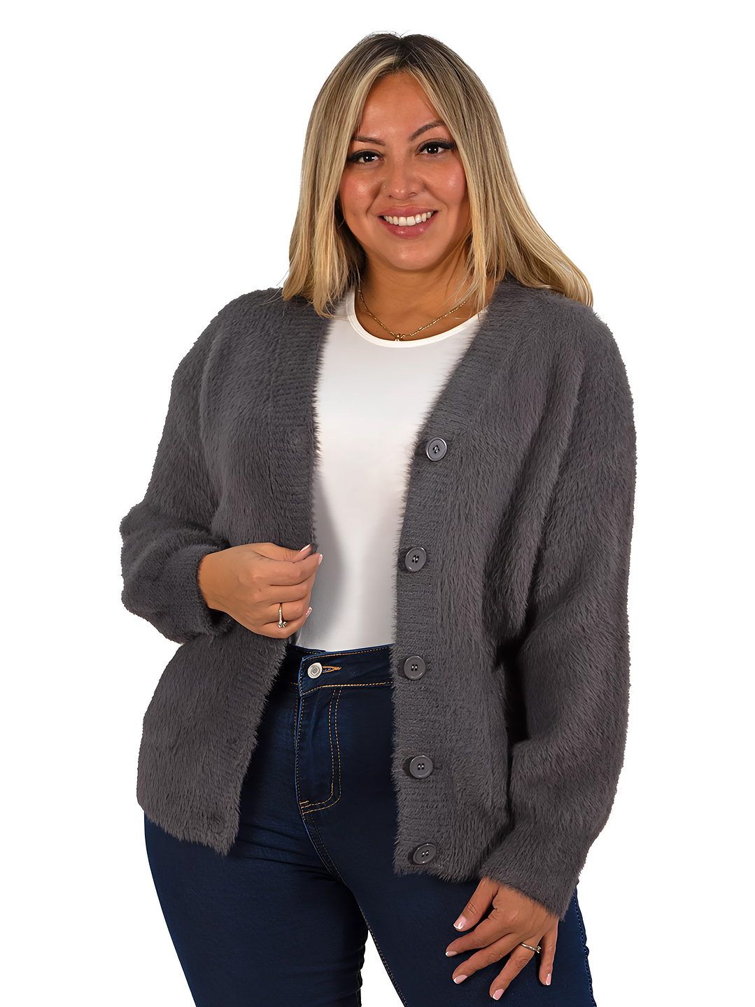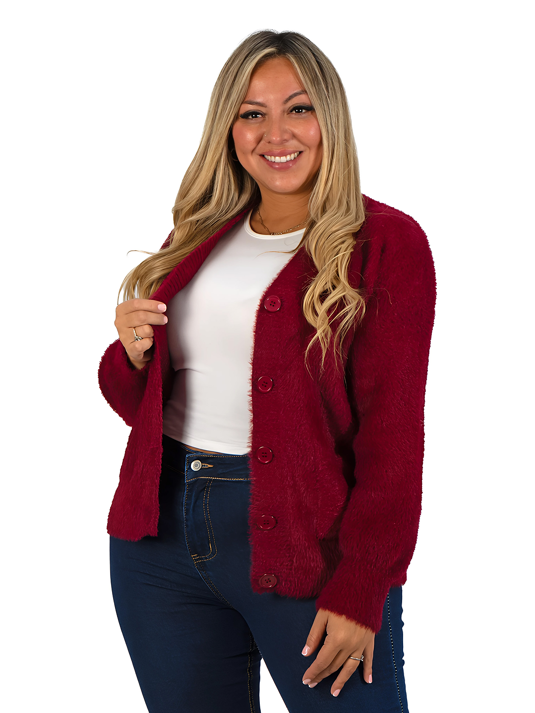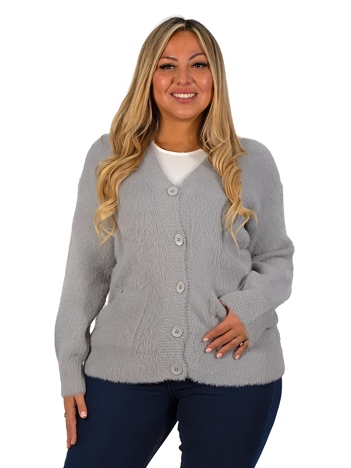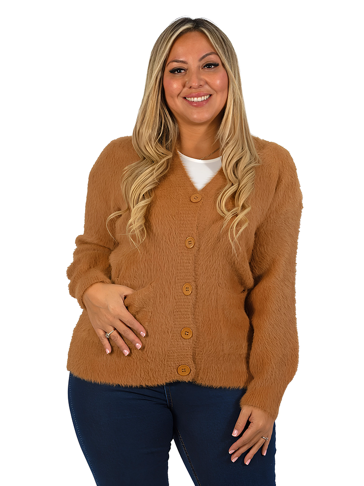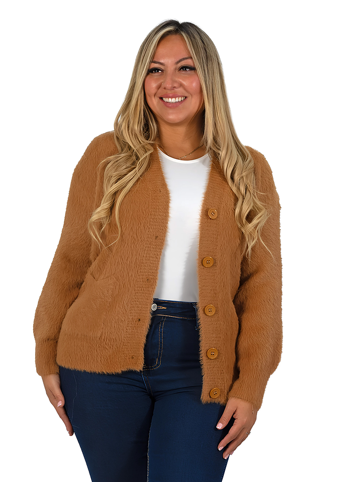 Lindo cardigan peludo para mujer, con textura suave y muy abrigadora. Cuenta con botones frontales, bolsillos laterales y cuello en V, ideal para los días fríos y fácil de combinar con cualquier look. Disponible en colores variados.
