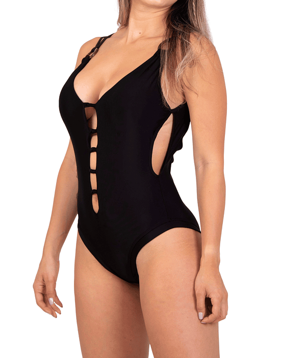 Redefine el traje de baño clásico con este diseño lleno de detalles modernos. Sus aberturas estratégicas en el frente y los costados crean un look actual y muy favorecedor. La espalda completamente descubierta con un lazo ajustable no solo es llamativa, sino que te permite adaptar la prenda a tu cuerpo para sentirte cómoda y segura.