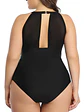 - Detalle de malla transparente en el escote que añade un toque de diseño sin perder la cobertura.