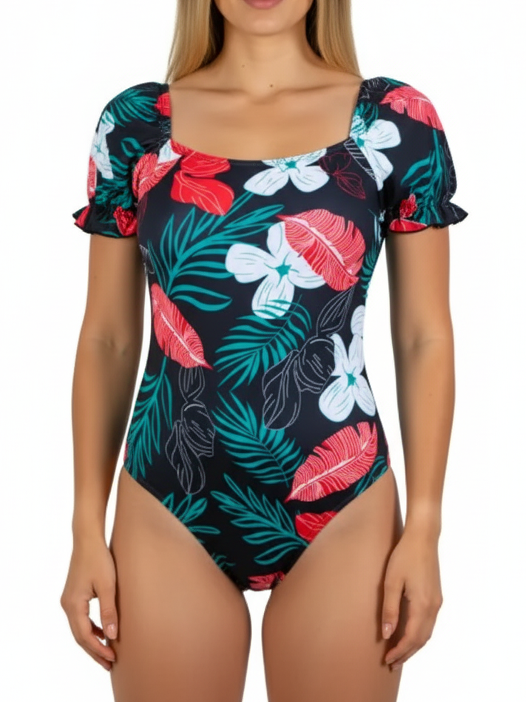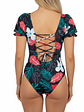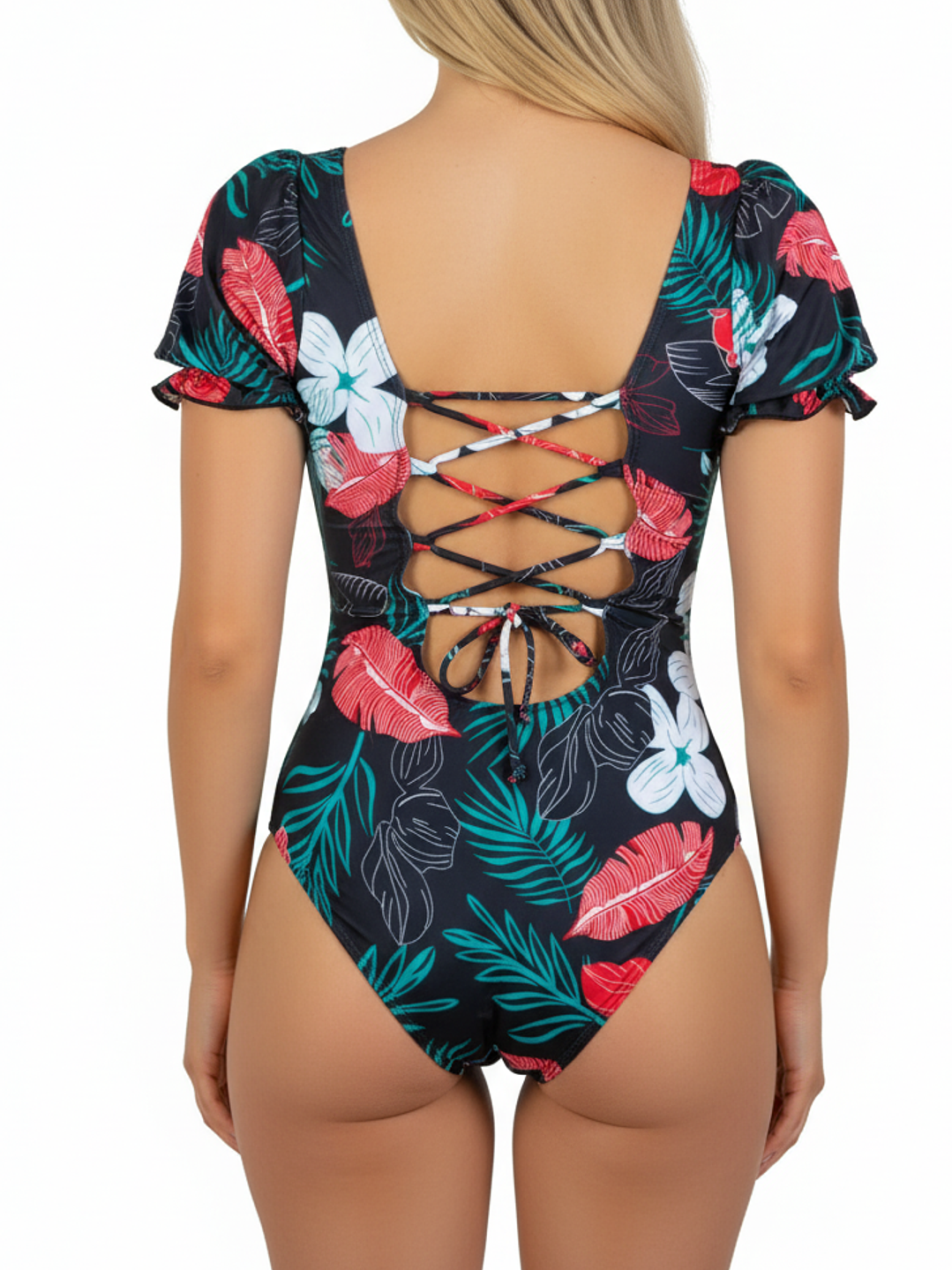 Sumérgete en el verano con este traje de baño de una pieza que combina comodidad y un diseño cautivador. Su estampado floral en tonos verdes y blanco resalta sobre un fondo negro, creando un look fresco y lleno de vida. Las mangas cortas ofrecen una cobertura adicional y un toque distintivo, mientras que el amarre en la espalda te permite ajustarlo perfectamente a tu figura, asegurando que te sientas tan bien como te ves.